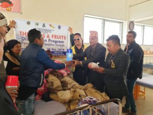 बढ्दै गएको जाडोको चिसो मौसममा आम्दा अस्पतालमा रहेको सुत्केरी विरामी तथा अन्य विरामीहरुलाई केही राहत मिलोस भनी २५ थान थर्मस र करिब ५० जनालाई फलफुल वितरण कार्यक्रम गरिएको क्लबका अध्यक्ष विश्वास बाबुले बताउनु भयो ।