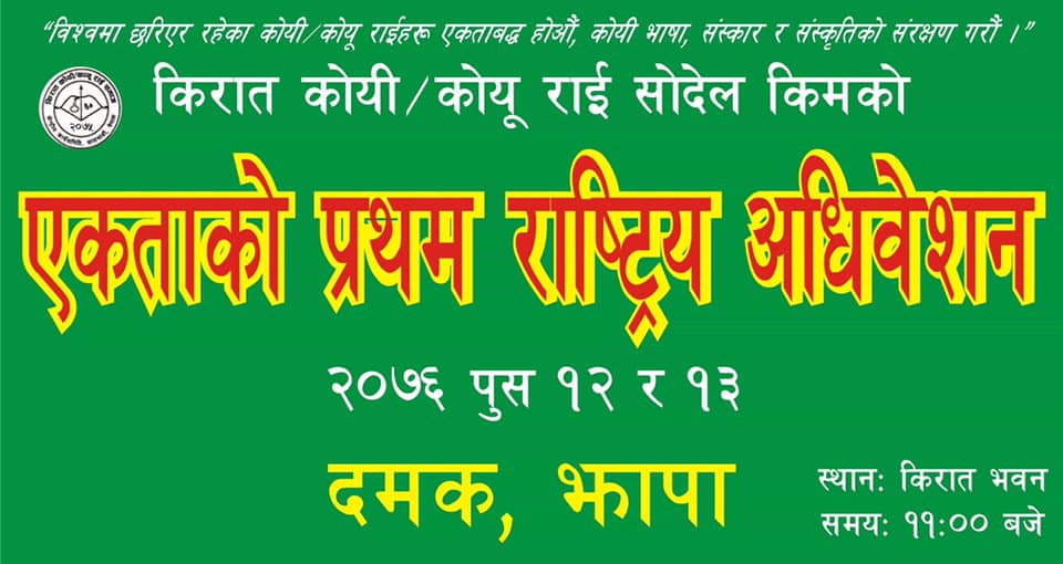 किरात काेयी/काेयू राई साेदेल किमकाे एकताकाे प्रथम राष्ट्रिय अधवेशन दमकमा हुने भएकाे छ । यहि पुष १२ गते देखी सुरू हुने एकता प्रथम राष्ट्रिय अधिवेशन दमकिस्थित किरात भवनमा हुने भएकाे छ ।