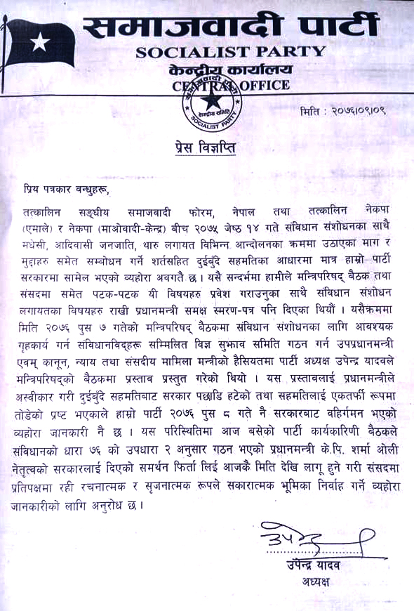 २०७५ जेष्ठ १४ गते मधेषी, आदिवासी, थारू लगायत विभिन्न आन्दाेलनका क्रममा उठाएका माग र मुद्दाहरू समेत सम्बाेधन गर्ने गरी संविधान संशाेधन गर्ने २ बुँदे सर्तमा समाजवादी पार्टी सरकारमा सहभागी भएकाे थियाे । साेहि अनुरूप पटक पटक संविधान संशाेधन लागि प्रयासहरू पनि गरिएकाे र मिति २०७६ पुष ७ गतेकाे मन्त्रिपरिषद् बैठकमा संविधान संशाेधनका लागि आवश्यक गृहकार्य गर्न संविधानविद्हरू सम्मिलित विज्ञ समिति गठन गर्न उपप्रधानमन्त्री एवम् कानून, न्याय तथा संसदीय मामिला मन्त्रीकाे हैसियमा पार्टी अध्यक्ष उपेन्द्र यादवले मन्त्रिपरिषद्काे बैठकमा प्रस्तुत प्रस्तावलाई अस्वीकार गर्दै २ बुँदे सहमतिबाट सरकार पछि हटेकाेले सरकार छाेडेर समर्थन फिर्ता लिएकाे विज्ञप्तीमा उल्लेख छ ।