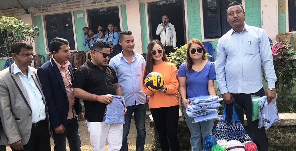 मेचीनगर ४ स्थित पशुपति माध्यमिक विद्यालयमा अध्ययनरत विद्यार्थीहरुलाई कलाकार मेलिना राईले खेलकुद सामग्री वितरण गरेकी छिन् । आज सोमबार एक कार्यक्रमकाबीच राष्ट्रिय ख्याति प्राप्त कलाकार राईले खेलकुद सामग्री प्रदान गरेकी हुन्।