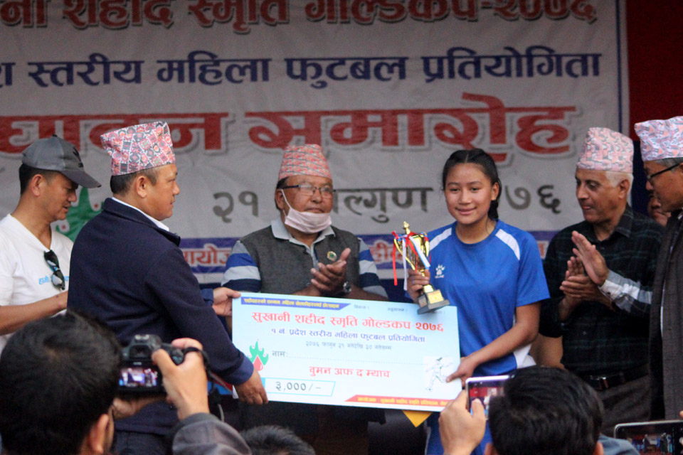 खेलको वुमन अफ दी म्याच ताप्लेजुङकी सुनकला राई घोषित भइन् । उनलाई १ नम्बर प्रदेश सांसद अर्जुन राई र अर्जुनधारा नगर पशुपक्षी, मत्स्य तथा कछुवा विकास शाखा प्रमुख पदमलाल राईले नगद ३ हजार पुरस्कार प्रदान गरे । त्यस्तै, खेलमा पहिलो गोल गर्ने सुनकलालाई स्थानीय शिवलाल गिरीले नगद एक हजार प्रदान गरे ।