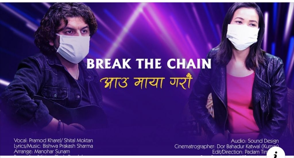 Break the chain ‘आऊ माया गरौँ, मान्छेले मान्छेलाई, प्रकृतिलाई, संसारलाई माया गरौँ’ बोलको गीतमा गायक प्रमोद खरेल र गायिका शितल मोक्तानको स्वर रहेको छ ।