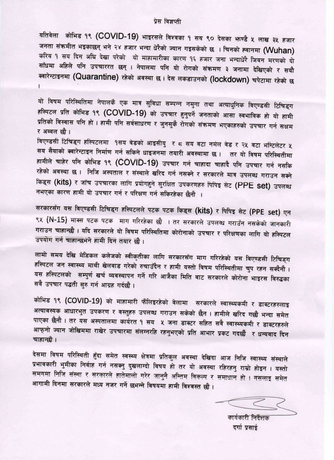 अस्पतालले सरकारसँग पटकपटक जाँच र उपचारका लागि प्रयोग हुने सुरक्षित उपकरणहरु किट्स, पिपिइ सेट, एन ९५ मास्क माग गरे पनि उपलब्ध गराउन नसकेको प्रसाईंले शुक्रबार विज्ञप्ति निकालेर जनाएका छन् । नेपालकै नमुना, अत्याधुनिक तथा सुविधासम्पन्न सो अस्पताल चार वर्षयता मेडिकल कलेजको सम्बन्धनको पर्खाइमा छ ।