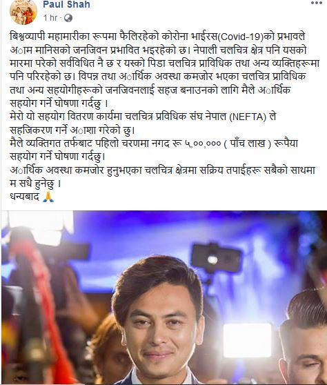 बिश्वव्यापी महामारीका रूपमा फैलिरहेकाे काेराेना भाईरस(Covid-19)काे प्रभावले अाम मानिसकाे जनजिवन प्रभावित भइरहेको छ। नेपाली चलचित्र क्षेत्र पनि यसको मारमा परेको सर्वविधित नै छ र यस्को पिडा चलचित्र प्राविधिक तथा अन्य व्यक्तिहरूमा पनि परिरहेको छ। विपन्न तथा आर्थिक अवस्था कमजोर भएका चलचित्र प्राविधिक तथा अन्य सहयोगीहरूकाे जनजिवनलाई सहज बनाउनकाे लागि मैले आर्थिक सहयाेग गर्ने घाेषणा गर्दछु ।