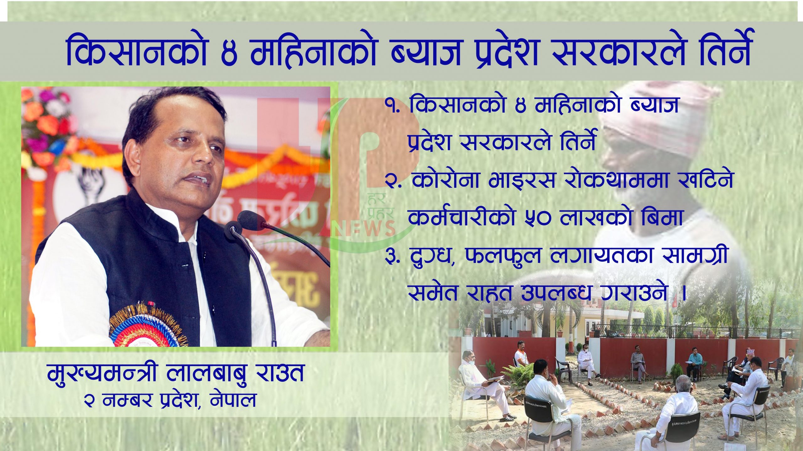 जनकपुरधाम, २८ चैत । २ नं. प्रदेश सरकारले किसानहरुले बैंक, वितिय संस्था वा सहकारी बाट लिएको ऋृणको ४ महिनाको व्याज प्रदेश सरकारले तिरिदिने निर्णय गरेको छ । कोरोना महामारी संक्रमण फैलिन नदिन सरकारले घाेषणा गरेकाे लकडाउनका कारण किसानहरुमा परेकाे असरलाइ मध्यनजर गरि प्रदेश सरकारले साे निर्णय गरेकाे हाे ।