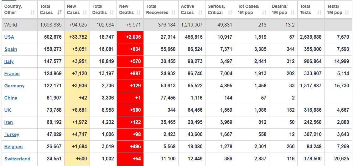 पछिल्लाे २४ घण्टालाइ मात्र हेर्ने हाे भने अमेरिकामा मात्र २ हजार ३५ जनाकाे मृत्यु भएकाे छ । चीनमा भने पछिल्लाे २४ घण्टामा १ जनाकाे मृत्यु भएकाे र ४२ जना नयाँ काेराेना संक्रमित भेटिएकाे छ ।