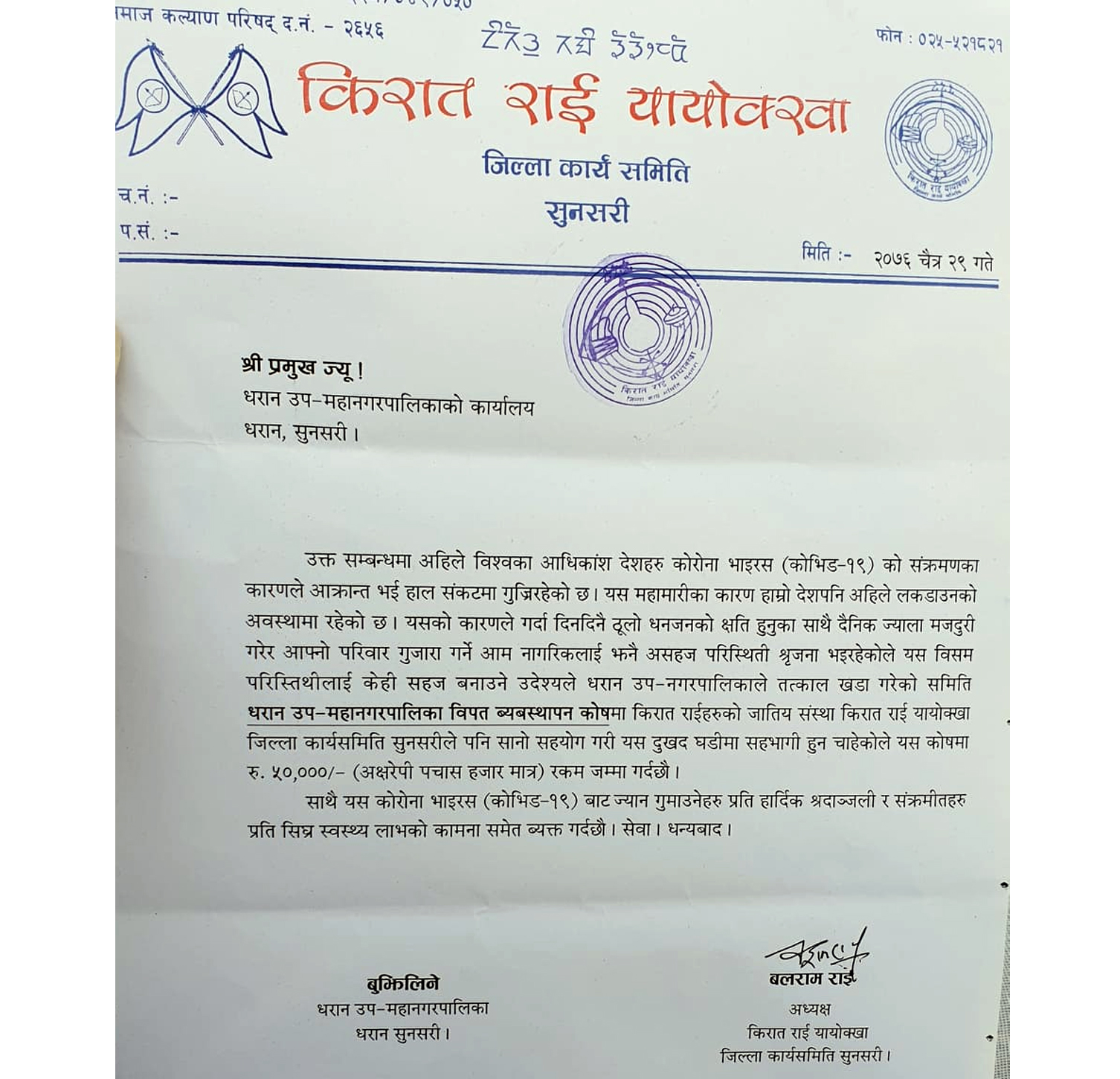 किरात राई यायाेक्खा जिल्ला कार्य समिति सुनसरीले धरान उपमहानगरको ‘कोरोना राहत कोष’ मा ५० हजार रुपैयाँ आर्थिक सहयोग गरेको छ ।