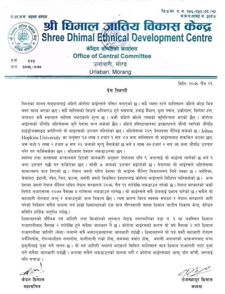 तर यस वर्षभने विश्वभर महामारीकाे रूपमा फैलिरहेकाे काेराेना भाइरसका कारण नेपालमा पनि बैशाख ३ गतेसम्म लकडाउन घाेषणा गरेकाे छ । याे महामारीकाे अवस्थामा जातिरी नलाग्ने भएकाेले सिमित व्यक्तिहरूमा धिमाल राजारानीमा गएर पुजा गर्ने धिमाल जातिय विकास केन्द्रका केन्द्रीय अध्यक्ष तेजबहादुर धिमाल र महासचिव केदार धिमालद्वारा जारी विज्ञप्तीमा उल्लेख गरिएकाे छ ।