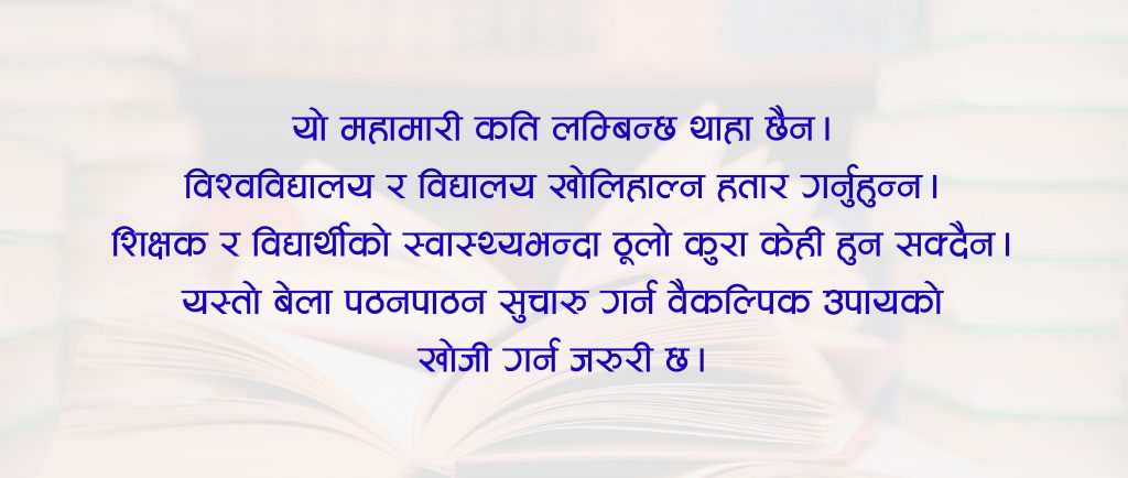प्रायः सबै देशमा अहिले घरबाटै कक्षा लिने व्यवस्था गरिएको छ। हाम्रोमा चाहिँ सरकारी निर्णयबमोजिम विद्यालय र विश्वविद्यालयहरू बन्द गरिएको छ।अहिले विभिन्न समूह बनाएर प्राध्यापक र शिक्षकले विद्यार्थीसँग छलफल चलाएको देखिन्छ। प्रविधिमैत्री शिक्षक समाजले प्रदेशस्तरमै जुमको प्रयोग गरेर महामारीमा कसरी पढाउने भनेर छलफल सुरु गरेका छन्। अनौपचारिक रूपमा पनि विभिन्न विषय शिक्षकको समूह बनाएर छलफल भएका छन्। यी सबै प्रयास संस्थागतभन्दा पनि शिक्षकहरूको आफ्नै जोडबलमा भइरहेका छन्। विश्वविद्यालयहरूमा पनि प्राध्यापकहरूको आफ्नै प्रयासमा अनलाइन छलफल र कक्षा भएका छन्। यस्ता प्रयास संस्थागत हुन जरुरी छ। अबको शिक्षणसिकाइमा प्रविधिको प्रयोग व्यापकरूपमा गर्न जरुरी छ ।