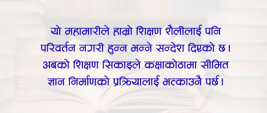 यो महामारीले हाम्रो शिक्षण शैलीलाई पनि परिवर्तन नगरी हुन्न भन्ने सन्देश दिएको छ। अबको शिक्षण सिकाइलेकक्षाकोठामा सीमित ज्ञान निर्माणको प्रक्रियालाई भत्काउनै पर्छ। प्रभावकारी सिकाइका लागि दैनिकरूपमा विद्यालय र विश्वविद्यालय नै जान जरुरी छैन। घरमै बसेर पनि केही सिक्न सकिन्छ। यसका लागि विभिन्न स्रोत रसाधन प्रयोग गर्न सकिन्छ। विभिन्न सूचना प्रविधिका साधन प्रयोग गर्न सकिन्छ। अहिले जुम, मुडल, क्यान्भस, माइक्रोसफ्ट, गुगलजस्ता विभिन्न कम्पनीले अनलाइन कक्षा लिने साधनहरूको विकास गरेका छन्। ती साधनहरूले विद्यार्थीसँग छलफल गर्न सहयोग गर्दछन्।