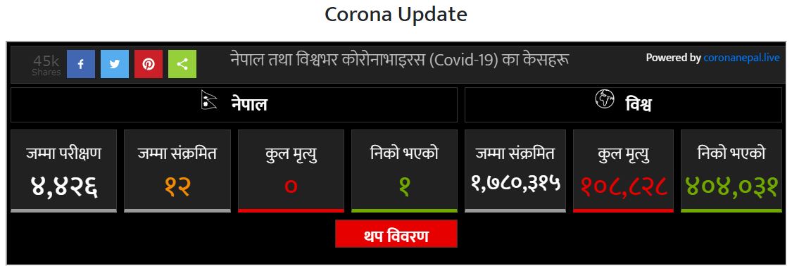 स्वास्थ्य तथा जनसंख्या मन्त्रालयका एक अधिकारीका अनुसार राष्ट्रिय जनस्वास्थ्य प्रयोगशाला टेकुमा उनीहरुको स्वाब परीक्षण गर्दा पोजेटिभ देखिएको हो । यो संगै नेपालमा कोरोना संक्रमितको संख्या १२ पुगेको काेराेना नेपाल लाइभमा उल्लेख गरिएकाे छ । तर वल्डाेमिटरमा भने नेपालमा काेराेना संक्रमित ९ जनानै कायम रहेकाे छ ।