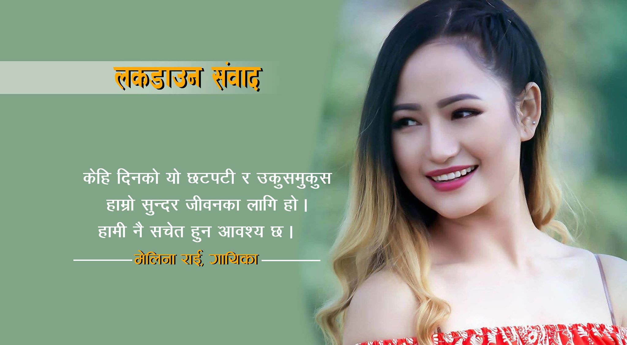 विश्वका लाखौं नेपाली श्रोेता–दर्शकको ढुकढुकी– मेलिना राई । नेपाली संगीत जगतमा ७० को दशकयता छुट्टै स्थान बनाउन सफल मेलिनाका सयौं गीत नेपाली मन मस्तिष्कमा गुञ्जिरहेको छ । उनै लाखौं संगीतप्रेमी नेपाली श्रोता–दर्शकको ढुकढुकी मेलिनासँग कोरोनाबाट विश्व आक्रान्त यो समयमा गरिएकोे ‘लकडाउन संवाद’ प्रस्तुत छः