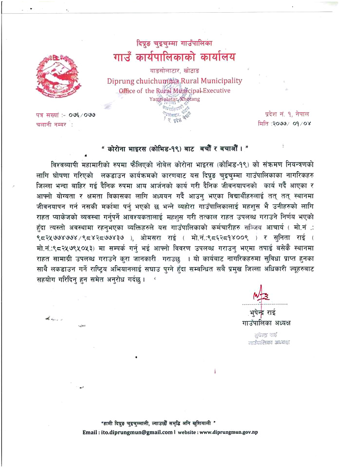 खाेटाङ, ५ बैशाख । खाेटाङकाे दिप्रुङ चुइचुम्मा गाउँपालिकाले गाउँपालिका भित्रका जिल्ला बाहिर बसेका नागरिकहरूलाई पनि राहत वितरण गर्ने भएकाे छ ।