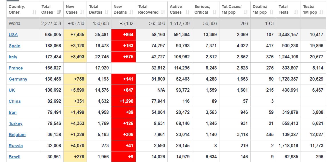 काठमाडाै, ५ बैशाख । काेराेना भाइरस (काेभिड १९)का कारण विश्वमा हालसम्म १ लाख ५० हजार ६ सय ३ जनाकाे मृत्यु भइसकेकाे छ । विश्वमा २२ लाख २७ हजार ३८ जना काेराेनाकाे संक्रमण पाेजेटिभ देखिएकाे छ भने ५ लाख ९१ हजार ३ सय ६४ जना निकाे भइसकेका छन् ।