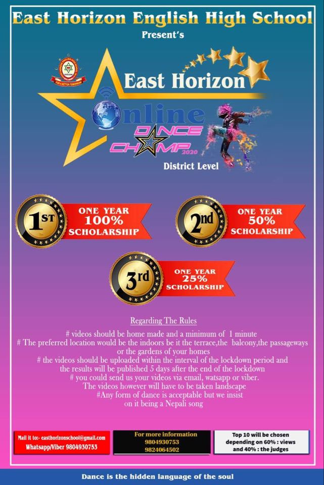 बिर्तामोड, ६ बैशाख । पढाई संगै अतिरिक्त कृयाकलापमा पनि अब्बल मानिएको झापाको धुलाबारी स्थित इस्ट होराइजन माविले झापा जिल्लास्तरीय अनलाइन नृत्य प्रतियोगिता गर्ने भएको छ ।