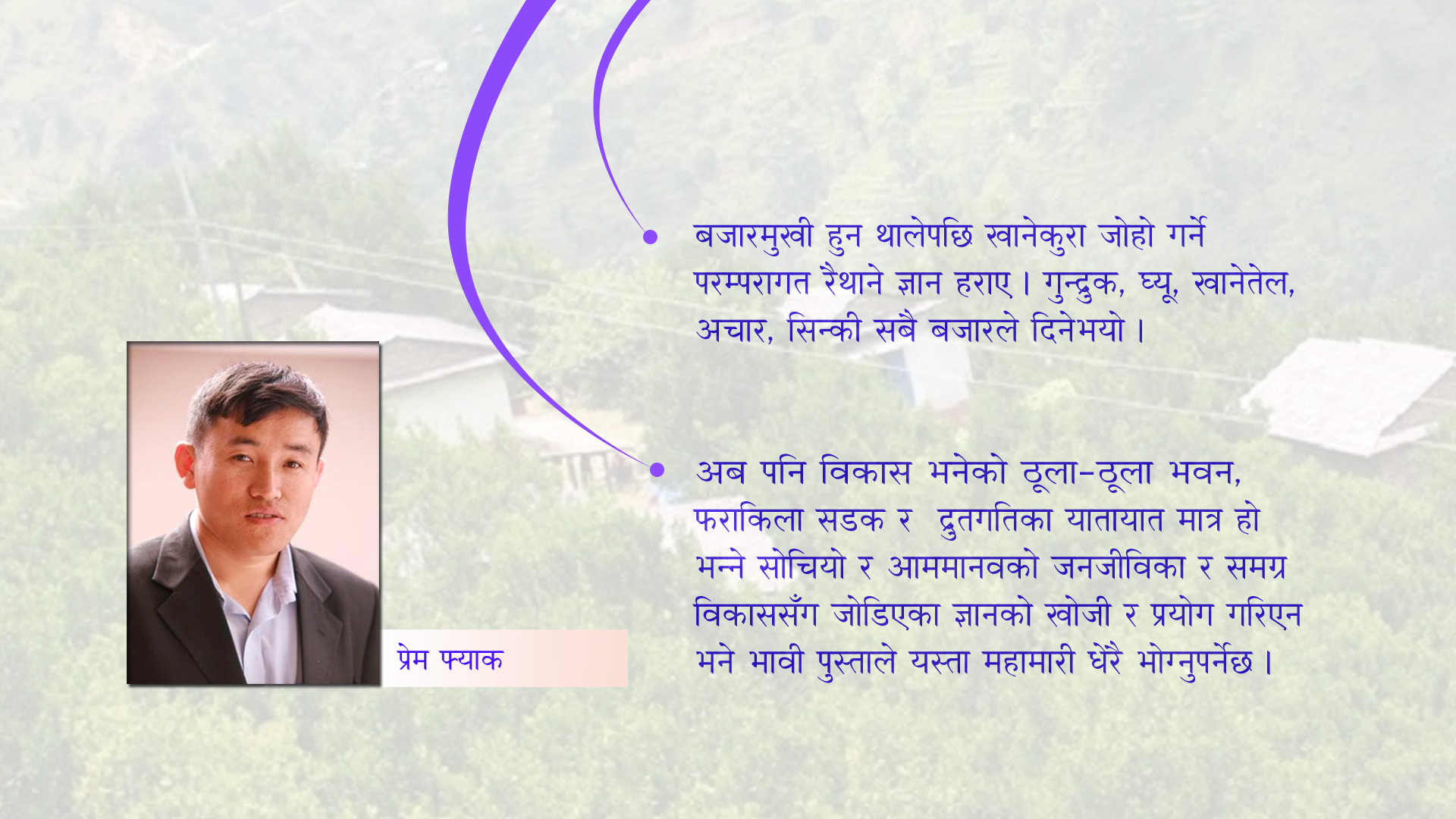 ज्वरो, निमोनिया, घाँटी र जीउ दुख्दा प्रयोग गरिने जडीबुटी घरबारीतिर रोप्न छाडियो । हाम्रो जीवनशैली बजारमा निर्भर भयो । यो महामारीले यही जीवनशैली र योसँग जोडिएका ज्ञानलाई परिवर्तन गर्न सोच्ने दिन आएको कुरा संकेत गरेको छ ।