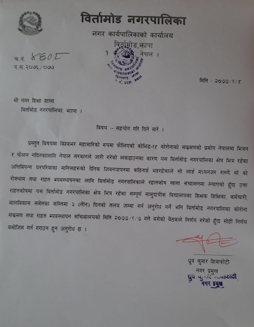 नगर प्रमुख ध्रुवकुमार सिवाकोटीले आइतवार बसेको सचिवालयको बैठकले यस्तो निर्णय गरेको बताए । ‘बैठकले नगर क्षेत्रभित्र रहेका सबै सामुदायिक विद्यालयका शिक्षक शिक्षिका, कर्मचारी र बालविकास कार्यकर्तालाई तीन दिनको पारिश्रमिक कोषमा जम्मा गर्न अनुरोध गर्ने निर्णय गरेको छ’, नगर प्रमुख सिवाकोटीले भने ।