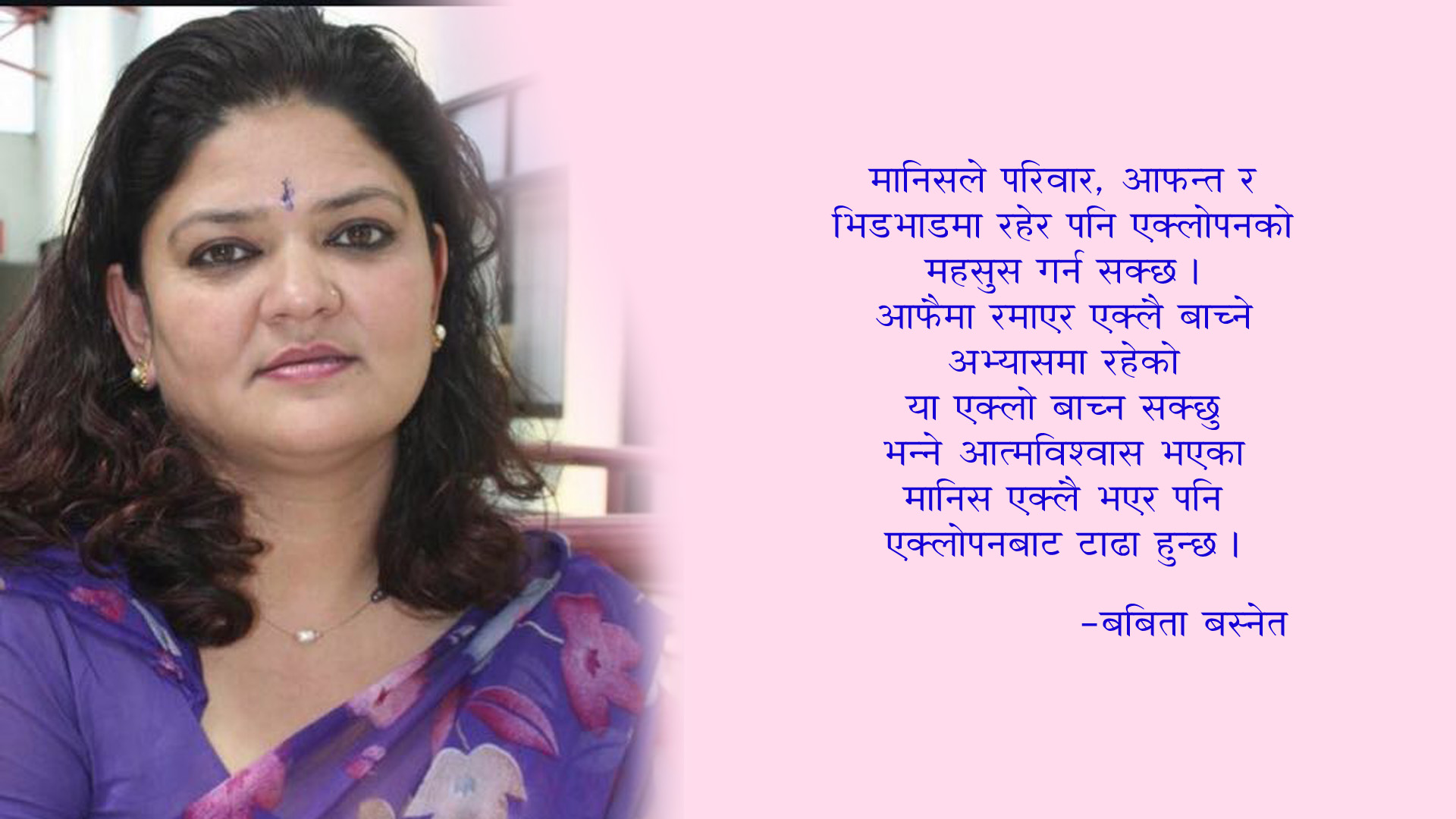 बिना मानसिक तयारी एक्कासी अहिले एक्लै बस्नुपर्ने परिस्थिति आउँदा मानिसहरू ठुलो फ्रस्ट्रेसनबाट गुज्रिएका छन् । जसका कारण मानिसको परिस्थिति मात्र होइन मनस्थिति पनि फरक बन्दै गएको छ । एक्लै बस्ने अभ्यास हामीमध्ये ज्यादै कममा मात्रै छ । कसैले म एक्लै बस्छु भन्यो भने त्यसलाई हाम्रो समाजमा धेरै ठुलो कुरा ठान्दै प्रश्न गरिन्छ– एक्लै ? कसरी सकेको होला … ! उ सहानुभूतिको पात्र बन्छ । भगवान गौतम बुद्धले २५ सय वर्षअगाडि आफैभित्र धेरै ठूलो अनुसन्धान गरेर ‘मानिस आफैभित्र हराएर एक्लै बस्न सक्यो भने दुःखी नहुने’ बताउनुभएको थियो । तर हामीले गौतम बुद्ध नेपालमा जन्मिएका हुन् भन्नेमा गर्व गरे पनि उहाँले के पत्ता लगाउनुभएको थियो, उहाँका उपदेशहरू के थिए र हामीले त्यसलाई कसरी उपयोग गरिरहेका छौँ भन्ने कुरामा भने ध्यान दिएका छैनौँ ।