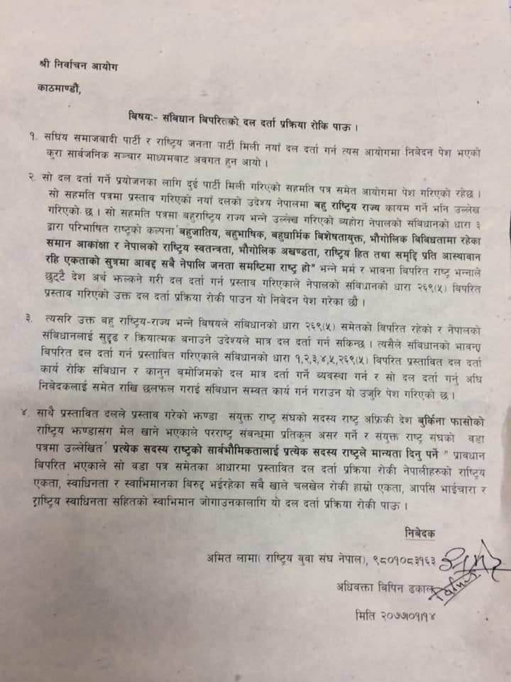 संविधानको मर्म र भावना विपरीत छुट्दै देशको अर्थ झल्किने गरी दल दर्ताको प्रस्ताव गरिएकोले संविधानको धारा २६९ विपरीत रहेको सो दल दर्ता प्रक्रिया रोक्न निवेदनमा माग गरिएको छ ।
