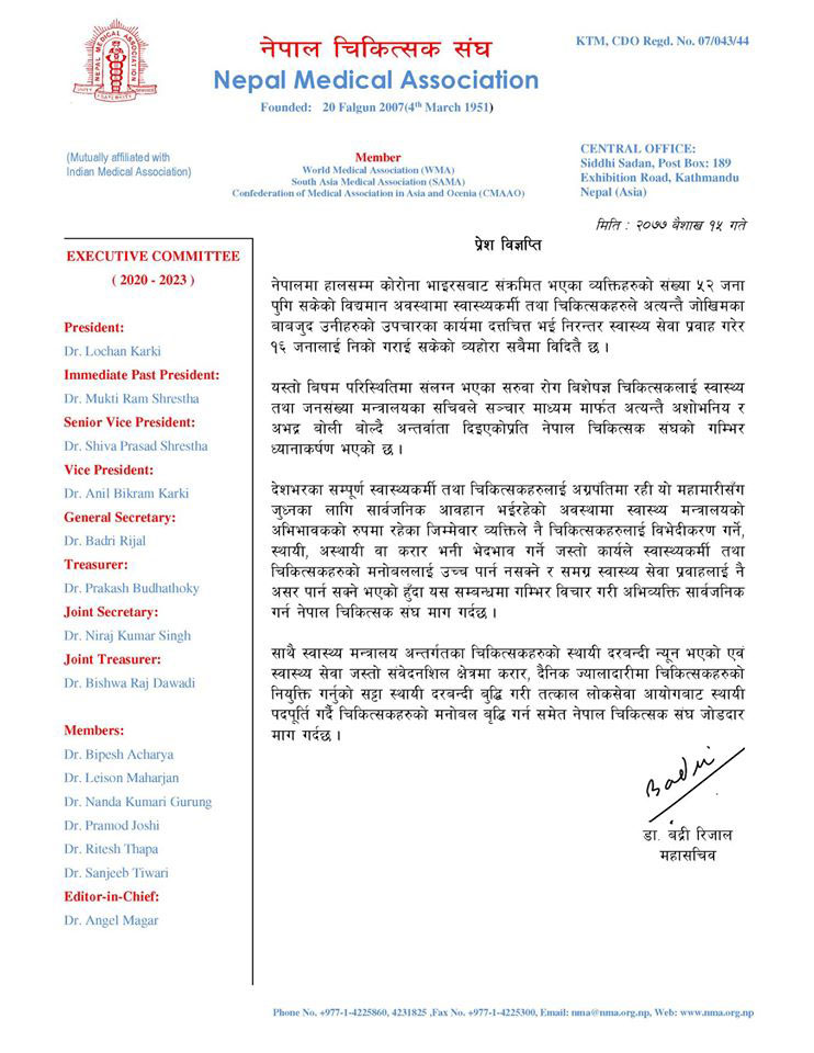 देशभरका सम्पूर्ण स्वास्थ्यकर्मी तथा चिकित्सकहरुलाई अग्रपंतिमा रही यो महामारसिँग जुध्नका लागि सार्वजनिक आवशहव भईरहेको अवस्थामा स्वास्थ्य मन्त्रालयको अभिभावकको रुपमा रहेका जिम्मेवार व्यक्तिले नै चिकित्सकहरुलाई विभेदीकरण गर्ने, स्थायी, अस्थायी वा करार भनी भेदभाव गर्ने जस्तो कार्यले स्वास्थ्यकर्मी तथा चिकित्सकहरुको मनोबाललाई उच्च पार्न नसक्ने र समग्र स्वास्थ्य सेवा प्रवाहलाई नै अवसर पार्न सक्ने भएको हुँदा यस सम्बन्धमा गम्भिर विचार गरी अभिव्यक्ति सार्वजनिक गर्न नेपाल चिकित्सक संघ माग गर्दछ ।