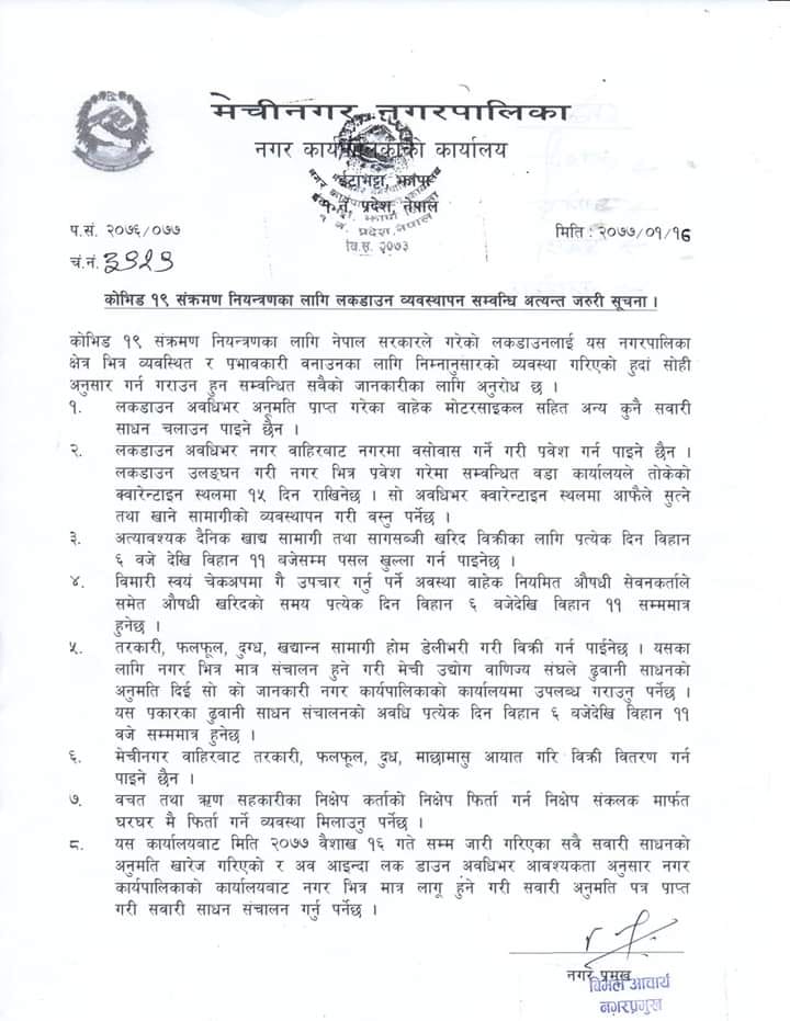 त्यस्तै अत्यावश्यक सामग्री खरिद बिक्रिका लागि नगरभित्रका पसलहरु बिहान ६ बजेदेखि बिहान ११ बजेसम्ममात्र खुला गर्न पाउने ब्यवस्था गरेको मेचीनगरका प्रमुख बिमल आचार्यले बुधवार पत्रकार सम्मेलनमा बताए ।