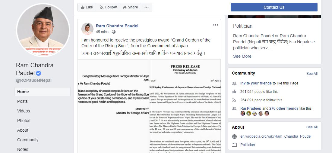 यता नेता पौडेलले पनि सामाजिक संजालमा फेसबुकमा सम्मानको लागि जापान सरकारलाई धन्यवाद दिएका छन् ।