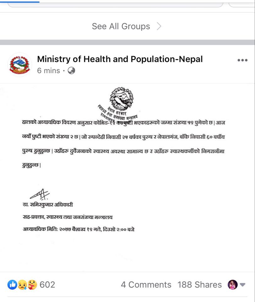 स्वास्थ्य मन्त्रालयकाको अफिसियल फेसबुक पेज मार्फत शुक्रबार बाँके र रूपन्देहीमा दुई जना कोरोना संक्रमित भेटिएको जानकारी गराएको छ ।