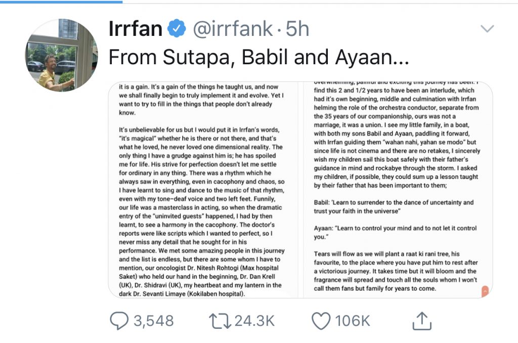 २५ वर्ष लामो वैवाहिक जीवनपछि श्रीमान गुमाएकी इरफानकी श्रीमती सुतपा सिक्दारले भावुक पत्र लेखेकी छिन् जुन इरफानको ट्वीटर अकाउन्टमा राखिएको छ। ५३ वर्षीय इरफानको बुधबार निधन भएको थियो। यस्तो छ पत्रको भावानुवाद :
