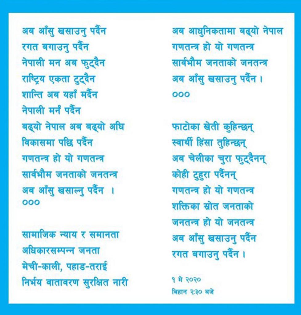काठमाडौं : विश्व श्रमिक दिवसको अवसरमा प्रधानमन्त्री केपी शर्मा ओलीले कविता सिर्जना गरेका छन् । प्रधानमन्त्रीका प्रेस सल्लाहकार सूर्य थापाले सामाजिक सञ्जालमार्फत् प्रधानमन्त्रीले मे दिवसको अवसरमा सिर्जना गरेको कवितासार्वजनिक गरेका हुन् ।