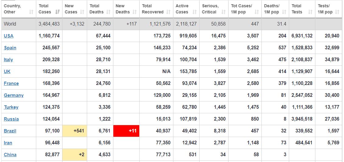 कोरोना भाइरसको संक्रमणबाट विश्वमा दुई लाख ४४ हजार सात सय ८० जनाको मृत्यु भइसकेको छ । विश्वमा महामारीको रुपमा फैलिएको भाइरसका कारण हालसम्म ३८ लाख ८४ हजार चार सय ८३ जना सङ्क्रमित भैसकेका छन् ।
