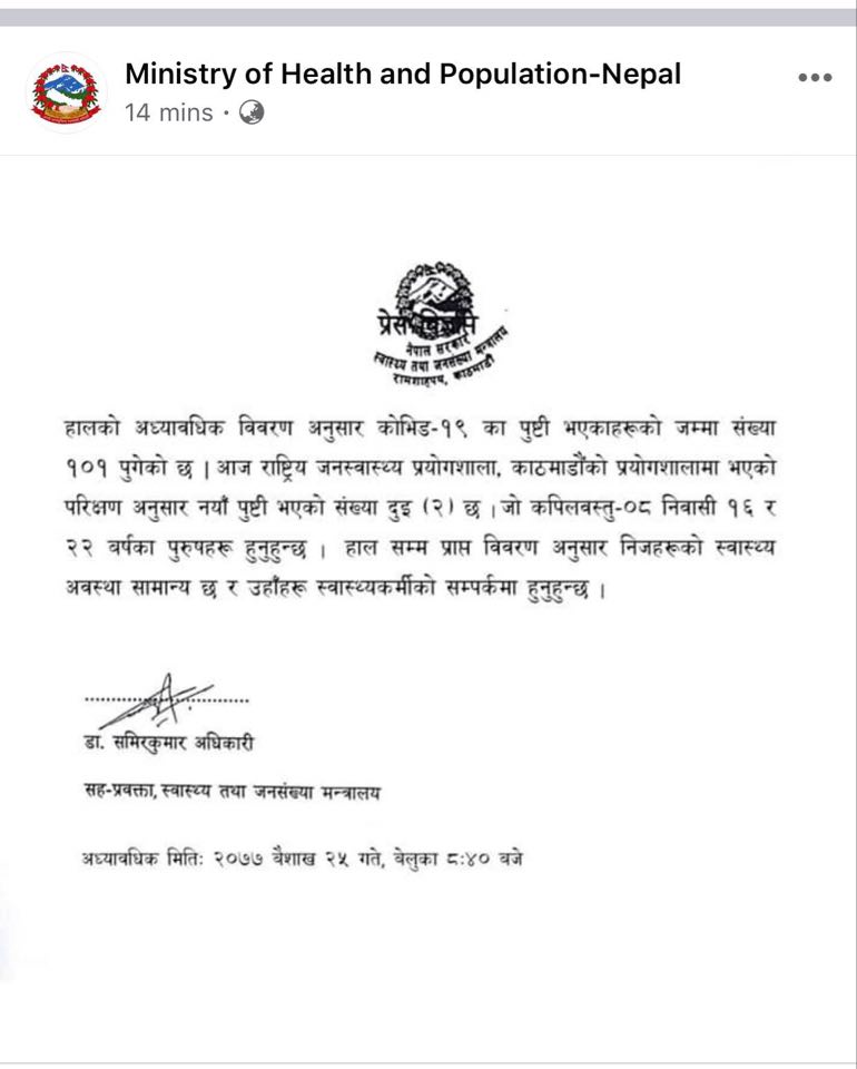 बिहीबार कपिलवस्तुका २ पुरूषमा कोरोनाभाइरसको संक्रमण पुष्टि भएसँगै संक्रमितको संख्या १०१ पुगेको स्वास्थ्य तथा जनसंख्या मन्त्रालयले बताएको छ ।