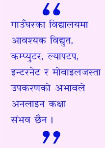 भौतिक पूर्वाधार : नेपालमा सार्वजानिक, सांस्थागत र गुठी गरी ३५ हजार हाराहारीमा विद्यालयहरु रहेका छन् । ग्रामिण क्षेत्रका सार्वजानिक विद्यालयहरुको भैतिक अवस्था ज्यादै दयनीय रहेका छन् । अधिकांश विद्यालयहरु दुर्गम भेगमा छन् । विद्युत, इन्टरनेट र कम्प्युटरजस्ता सामग्रीहरुको अभाव छ । गाउँका तुलननमा शहरका विद्यालयहरु भौतक सुविधासम्पन्न छन् । तसर्थ, शहरमा विद्यार्थीको प्रवाह बढी छ । भिडभाड बढी हुने क्षेत्रमा कारोना संक्रमणको संभावना बढी छ ।