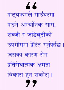 पाठ्यक्रम : विभिन्न भाइरसहरुबाट हुने महामारी, असर र यसबाट बच्ने उपाय विज्ञान, सामाजिक जस्ता अनिवार्य विषयको पाठ्यक्रममा समेट्न आवश्यक छ । विद्यार्थीलाई प्रकृतिसँगको विवेकपूर्ण अन्तरक्रियातर्फ पे्ररित गर्ने पाठ्यक्रम निर्माण गरिनु पर्दछ । कार्वन उत्र्सजन कमी गर्ने र प्राकृतिको संरक्षण सम्बन्धी सामग्री पाठ्यक्रमले समेट्नु पर्छ । पाठ्यक्रमले गाउँघरमा पाइने अग्र्यानिक साग, सब्जी र जडिबुटीको उपभोगमा प्रेरित गर्नुपर्दछ । जसका कारण रोग प्रतिरोधात्मक क्षमता विकास हुन सकोस् ।