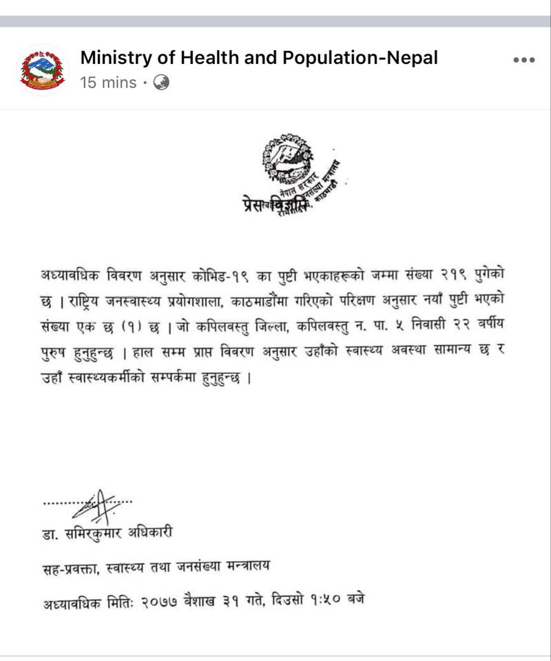 काठमाडौं,३१ बैशाख । कपिलबस्तुमा बुधबार थप एकजनामा कोरोना भाइरस को संक्रमणको पुष्टि भएको छ । यो संगै नेपालमा कोरोना संकमितको संख्या २१९ पुगेको छ ।