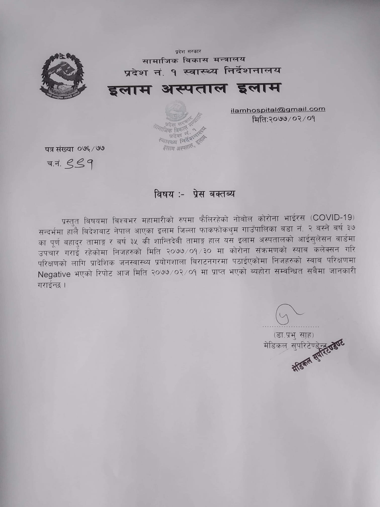 इलाम अस्पतालकाे आइसुलेशनमा उपचार भइरहेका फाकफोक थुम गाउँपालिका वडा नं. २ का ३७ वर्षीय पूर्णबहादुर तामाङ्ग र ३५ वर्षीया शान्तिदेवी तामाङ्गको रिपाेर्ट नेगेटिभ आएकाे इलाम अस्पताले जनाएकाे छ ।