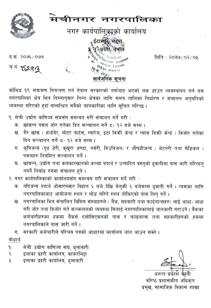 मेची उद्योग बाणिज्य संघसँग समन्वय गरी खाद्यन्न पसल जोर गतेका लागि कायम गरिएको छ । हार्डवयर, मोटर पार्टस, ग्यारेज, इटा बिक्री केन्द्र, ग्यास बिक्री केन्द्र विजोर गते दैनिक विहान ८ देखि दिउँसो १२ बजेसम्म मात्र सञ्चालन गर्न पाइने नगरपालिकाले जनाएको छ ।