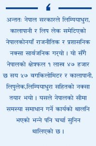 अन्ततः नेपाल सरकारले लिम्पियाधुरा, कालापानी र लिपुलेक समेटिएको नेपालको नयाँ राजनीतिक र प्रशासनिक नक्सा सार्वजनिक गर्यो । यो सँगै नेपालको क्षेत्रफल १ लाख ४७ हजार ५ सय ५७ वर्गकिलोमिटर कालापानी, लिपुलेक र लिम्पियाधुरा सहितको नयाँ नक्सा तयार भयो । यसले नेपालको सीमा समस्या समाधान गर्ने कार्यको थालनि भएको भन्ने पनि चर्चा सुनिन थालिएको छ ।