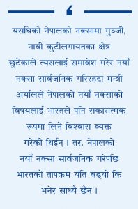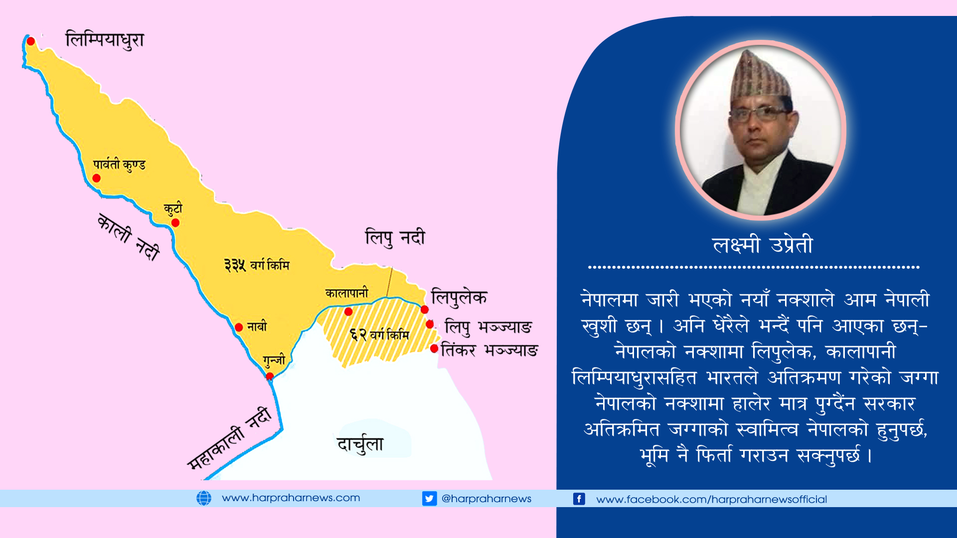 भनौ नेपालमा जारी भएको नयाँ नक्शाले आम नेपाली खुशी छन् । अनि धेरैले भन्दैं पनि आएका छन् नेपालको नक्शामा लिपुलेक, कालापानी लिम्पयाधुरासहित भारतले अतिक्रमण गरेको जग्गा नेपालको नक्शामा हालेर मात्र पुग्दैं सरकार अतिक्रमित जग्गाको स्वामित्व नेपालको हुनुपर्छ , भूमि नै फिर्ता गराउन सक्नुपर्छ ।