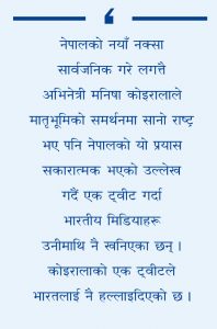 नेपालको नयाँ नक्शा सार्वजनिक गरे लगत्तै अभिनेत्री मनिषा कोइरालाले मातृभूमिको समर्थनमा सानो राष्ट्र भए पनि नेपालको यो प्रयास सकारात्मक भएको उल्लेख गदैं एक ट्वीट गर्दा भारतीय मिडियाहरु उनीमाथि नै खनिएका छन् । कोइरालाको एक ट्विटले भारतलाई नै हल्लाइदिएको छ । जसमा उनले मात्र सानो देश भए पनि आफ्नो स्वाधीनता र अस्तित्व जोगाएकोमा नेपाल सरकारलाई धन्यवाद दिएकी थिइन् । त्यही विषयलाई लिएर सबै भारतीय मिडिया उनीविरुद्ध जाइलागेका छन् । भारतीय मिडियाहरु उनलाई गाली गरिरहदा अहिले नेपाली कलाकारहरुले उनको समर्थनमा अभिब्यक्ति दिएका छन् ।