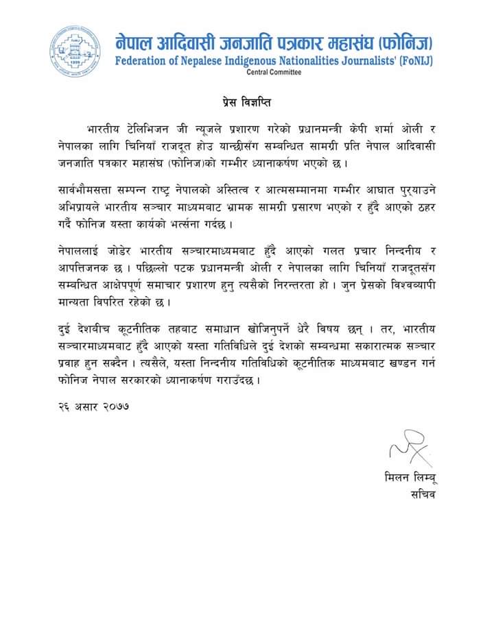 नेपाललाई जोडेर भारतीय सञ्चारमाध्यमबाट हुँदै आएको गलत प्रचार निन्दनीय र आपत्तिजनक रहेको भन्दै पछिल्लो पटक प्रधानमन्त्री ओली र नेपालका लागि चिनियाँ राजदूतसँग सम्बन्धित आक्षेपपूर्ण समाचार प्रशारण हुनु त्यसैको निरन्तरता रहेको र उक्त कार्य प्रेसको विश्वव्यापी मान्यता विपरित रहेको फोनिजद्धारा जारी विज्ञप्तीमा उल्लेख छ ।