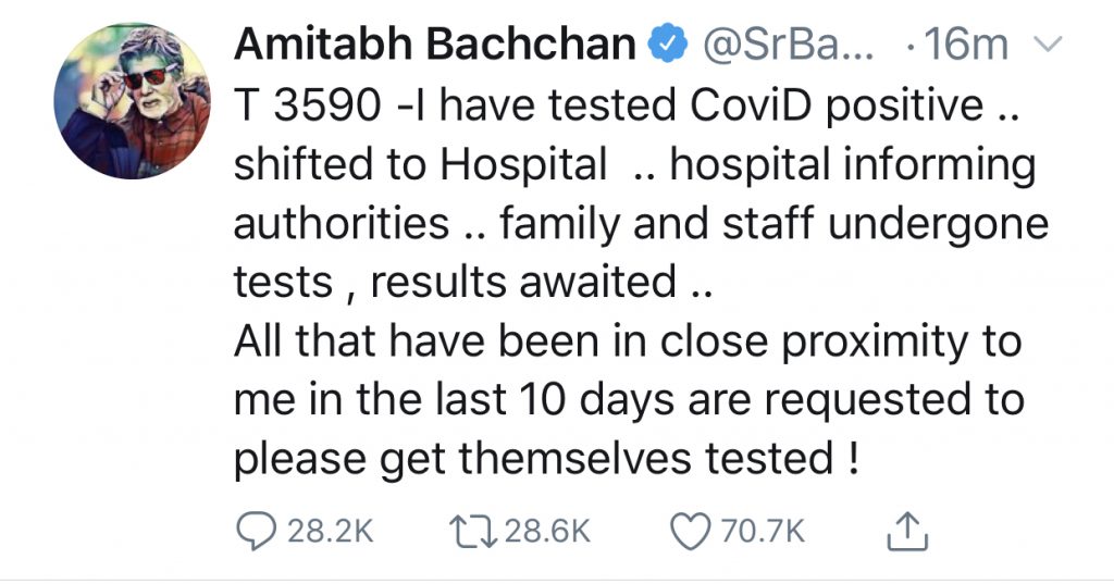 बच्चनले आफ्नाे आधिकारिक फ़ेसबुक र ट्वीटर मार्फत आफूलाई काेराेना पाेजिटिभ भएकाे लेखेका छन् ।