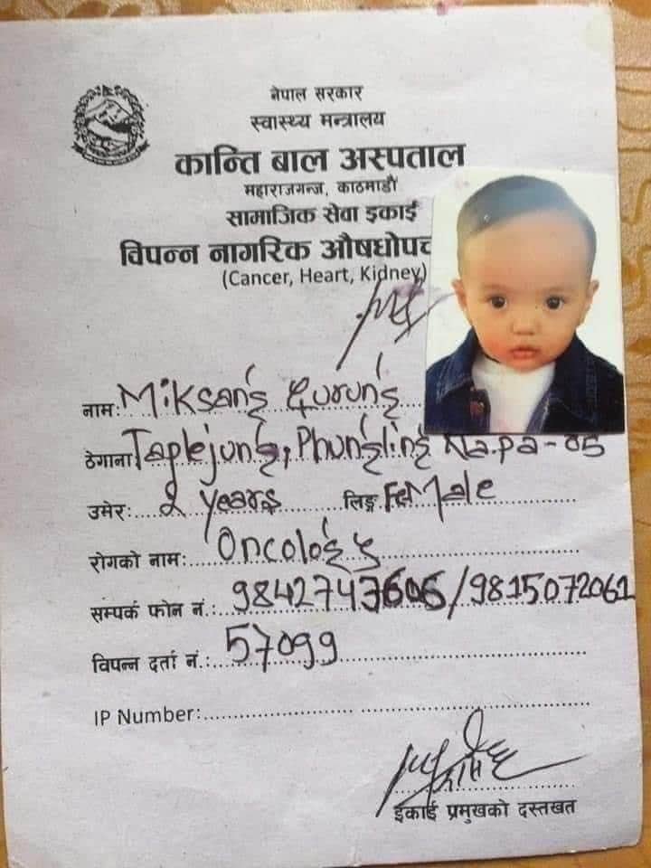 ताप्लेजुङ फुङलिङ न.पा. वडा.न.५ का सन्तोष गुरुङ र सोनिया गुरुङकि २ बर्सिय छाेरी मिक्साङ गुरुङ लाई ब्रोन म्यारो भएका कारण हाल उनको काठमाडौंकाे बाल कान्ति अस्पताल महाराजगन्जमा उपचार भईरहेकाे छ ।