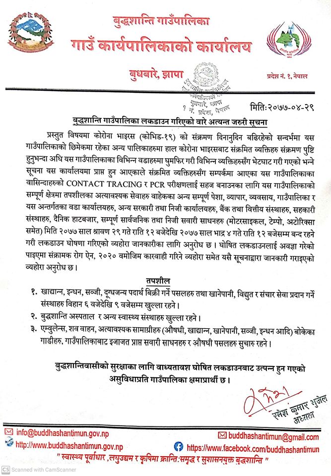 झापा ,२९ साउन । झापाको बुद्धशान्ति गाउँपालिकाले आज राति १२ बजेदेखि लागु हुने गरी एकहप्ता सम्म गाउँपालिका क्षेत्र भित्र लकडाउन गर्ने निर्णय गरेको छ ।