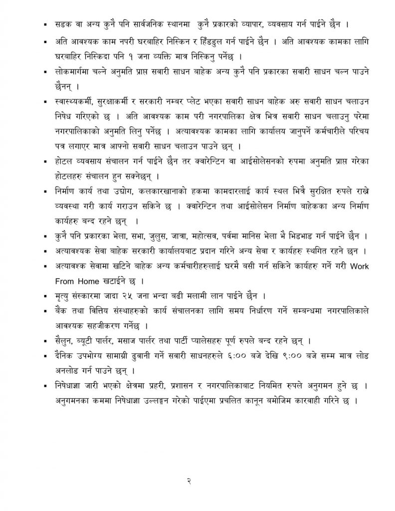 दैनिक उपभोग्य समाग्री खरिद गर्नका लागि सामाजिक दुरी कायम गर्दै सुरक्षाका उपाय अपनाएर बिहान ७ बजेदेखि दिउँसो १२ बजेसम्म पसल तथा ब्यवसाय खोल्न पाइने बताइएको छ ।