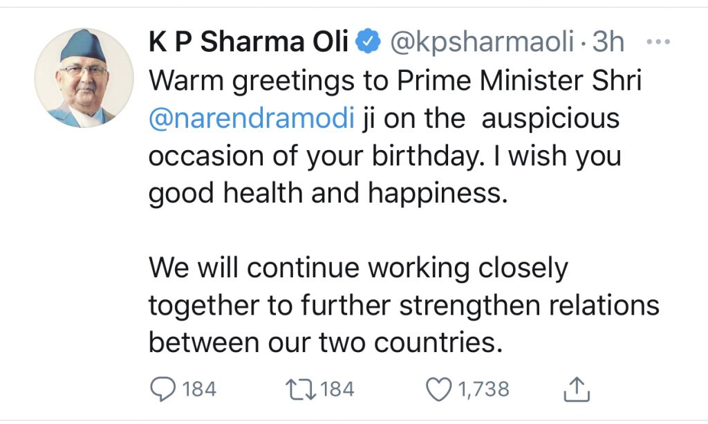 उनले लेखेका छन् ‘तपाईँको जन्मदिनको शुभ अवसरमा सु-स्वास्थ्य र खुसीको कामना गर्दछु, हामी दुई देशबीचको सम्बन्धलाई अझ प्रगाढ बनाउन निरन्तर लाग्नेछौँ।’
