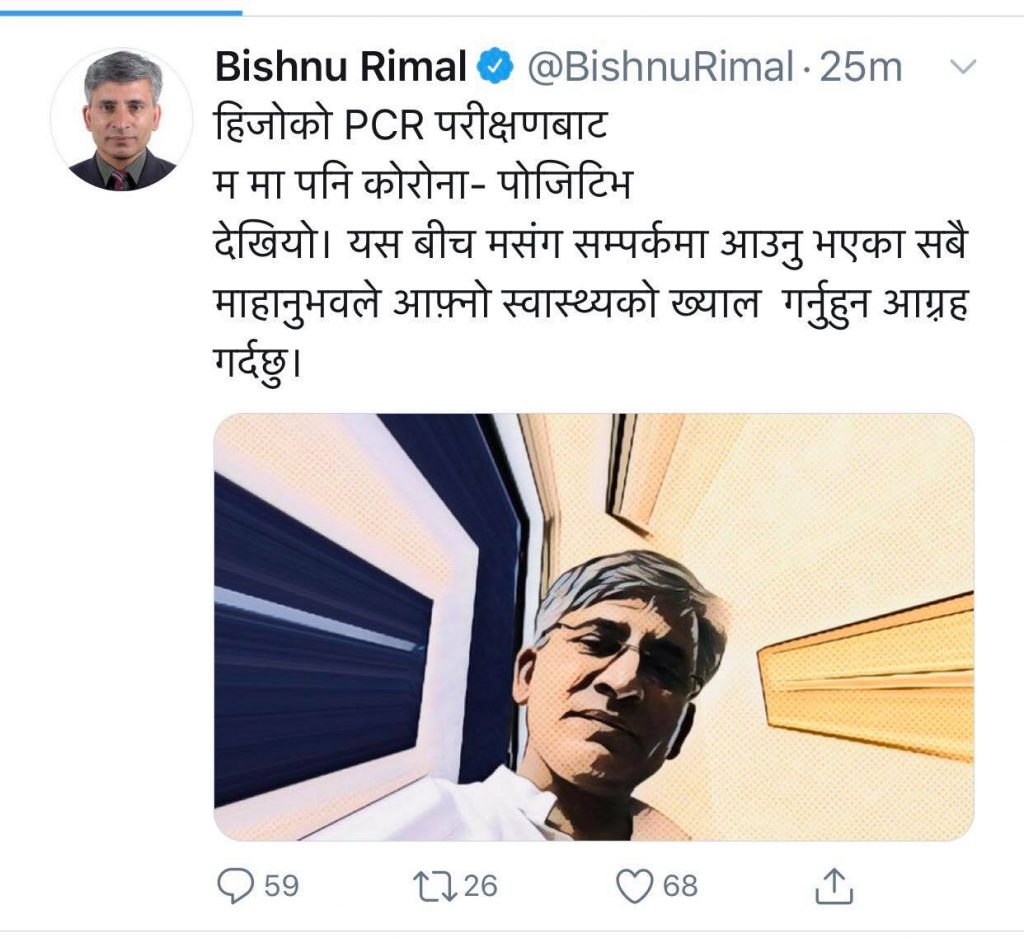 रिमालले शनिबार अपराह्न आफ्नो ट्विटमार्फत आफूलाई कोरोना संक्रमण भएको पुष्टि गरेका हुन्।