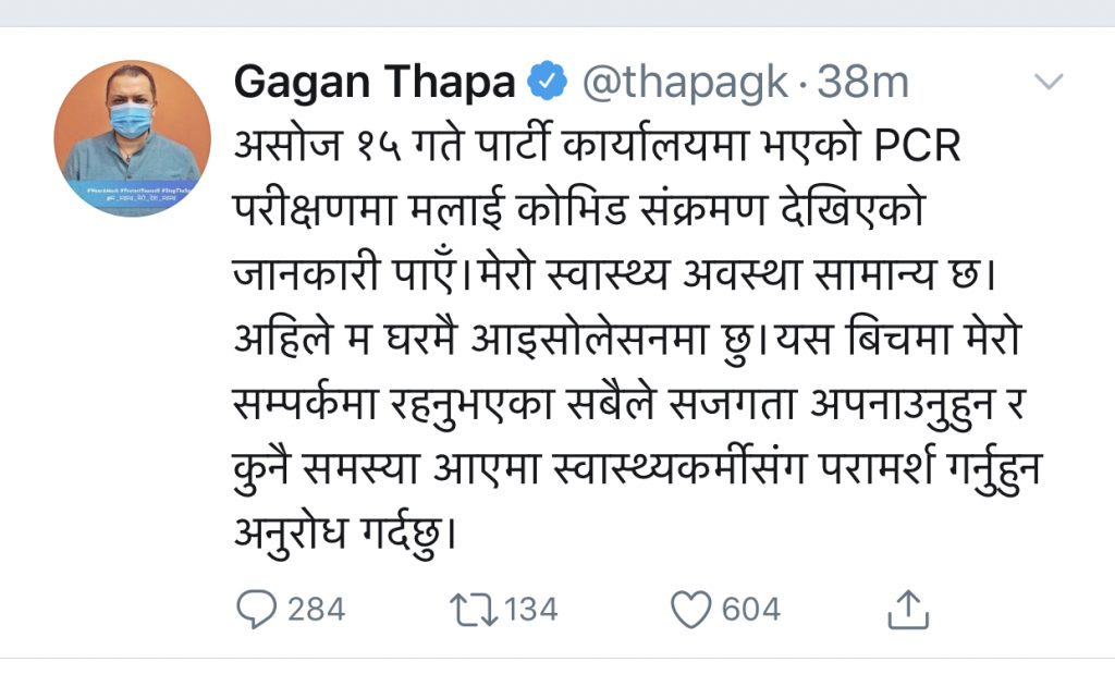 त्यस्तै थापाले यसबीचमा आफ्नो सम्पर्कमा आएका सबैलाई सजगता अपनाउन र कुनै समस्या आए स्वास्थ्यकर्मीसँग परामर्श गर्न पनि अनुरोध गरेका छन् ।
