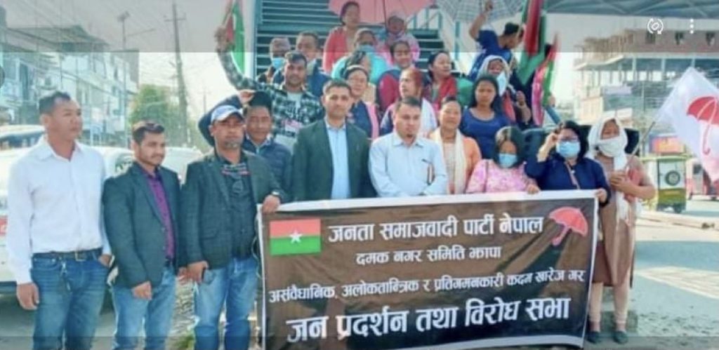 दमक, ९ फागुन । जनता समाजवादी पार्टी दमक नगर समितिले आइतबार प्रधानमन्त्री केपी ओली विरुद्ध प्रदर्शन र विरोधसभा गरेको छ ।