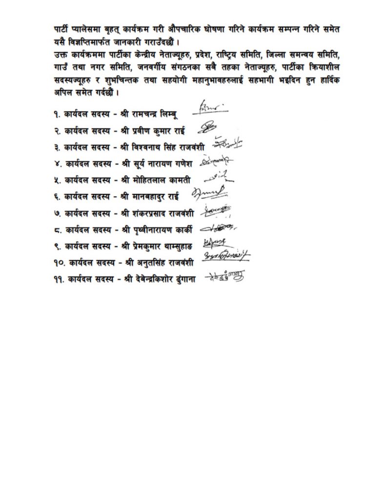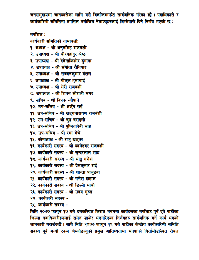 विग्यप्तिमा जनाइए अनुसार अनुतसिंह राजवंशीको अध्यक्षतामा २२५ सदस्यीय जिल्ला समन्वय समिति बन्ने छ भने २५ सदस्यीय जिल्ला कार्यकारिणी समितिका उपाध्यक्षहरुमा क्रमश: वीरबहादुर श्रेष्ठ, देबेन्द्रकिशोर ढुङ्गाना, सङ्गीता रौनियार, सज्जनकुमार वंशल, गोकुल हुमाँगाई, मेरी राजवंशी र शिवन सोराली मगर छन् । त्यस्तै सचिवमा दिपक न्यौपाने, उप-सचिवहरुमा अर्जुन राई, खड्गनारायण राजवंशी, बुद्ध बराइली, पुष्पितादेवी साह र रमा मेचे छ्न् ।