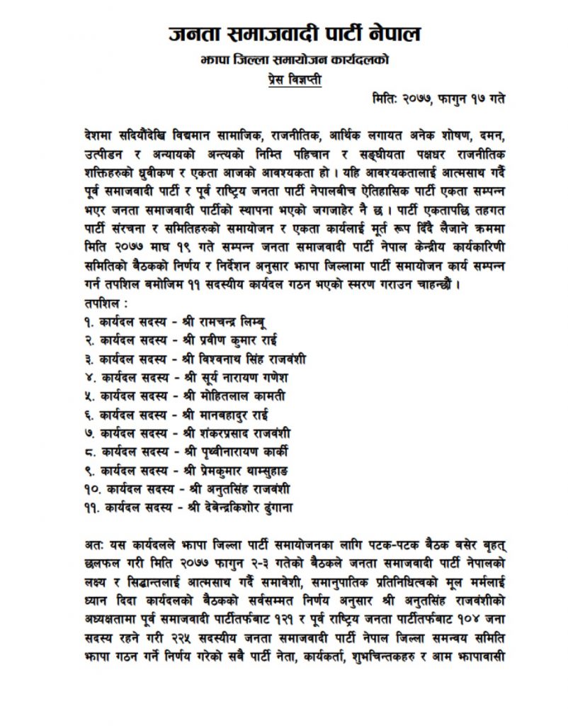 दमक, १७ फागुन । जनता समाजवादी पार्टी नेपालको झापा जिल्ला समायोजन टुङ्गिएको छ ।